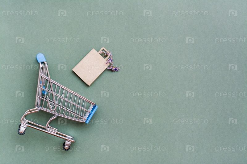 Экологичный ремесленный бумажный пакет с сушеными цветами, вылетающими из корзины на зеленом фоне. Черная пятница распродажа подарков