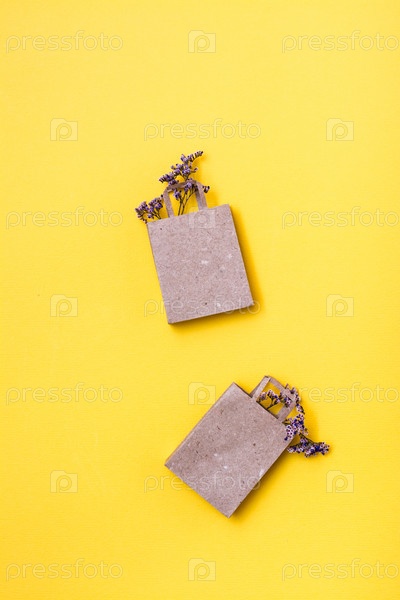 Пара экологически чистых бумажных сумок для покупок с сушеными цветами на желтом фоне. Черная пятница распродажа подарков. Вертикальный вид