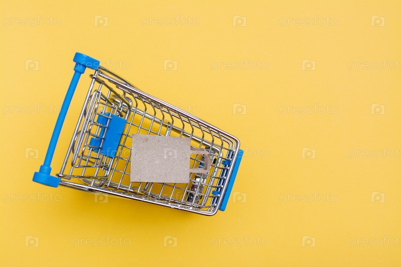 Экологичный ремесленный бумажный пакет в металлической корзине на желтом фоне. Черная пятница, распродажа подарков. Вид сверху