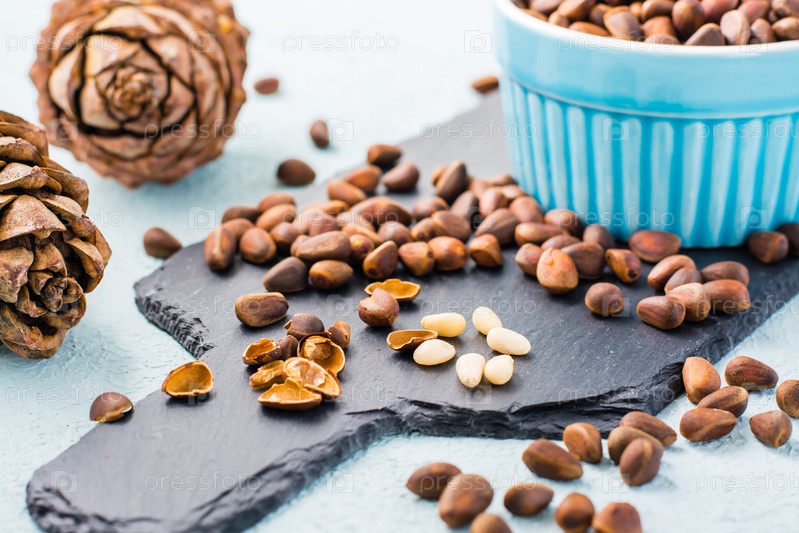 Несколько очищенных кедровых орехов среди орехов в скорлупе на грифельной доске. Средство от бессонницы и детокс-питание. Витамины и здоровье