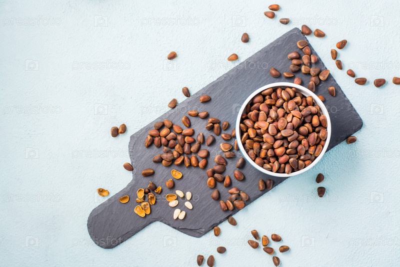 Несколько очищенных кедровых орехов среди орехов в скорлупе и миска орехов на грифельной доске. Средство от бессонницы и детокс-питание. Витамины и здоровье. Вид сверху
