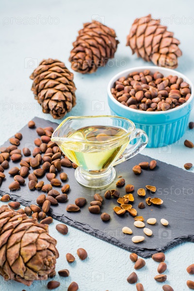 Свежее кедровое масло, орехи в миске и на грифельной доске. Средство от бессонницы и детокс-питание. Витамины и здоровье. Вертикальный вид
