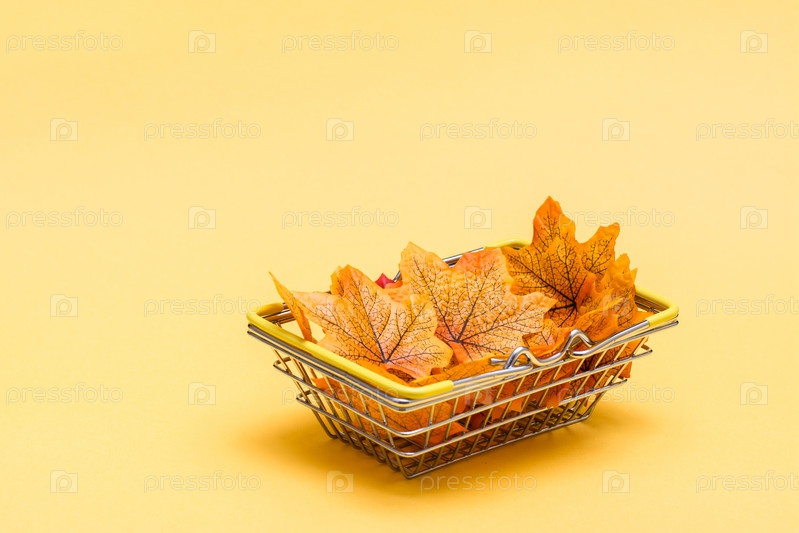 Металлическая корзина в магазине, наполненная осенними листьями на желтом фоне. Черная пятница распродажа подарков
