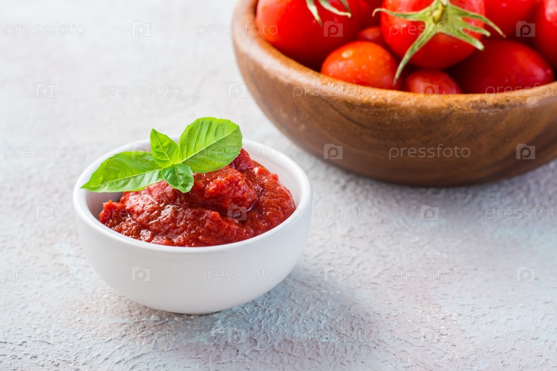 Томатная паста и листья базилика в миске и помидоры на тарелке на светлом фоне. Овощная и вегетарианская пища. Витамины и детокс-диета