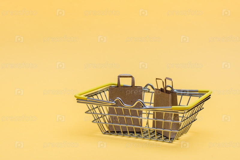 Металлическая корзина для покупок в магазине и пара бумажных пакетов на желтом фоне. Черная пятница распродажа подарков. Копировать пространство