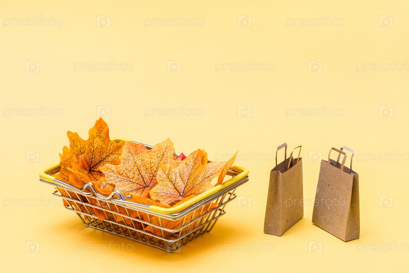 Металлическая корзина для покупок в магазине, наполненная осенними листьями и парой бумажных пакетов на желтом фоне. Черная пятница распродажа подарков. Копировать пространство