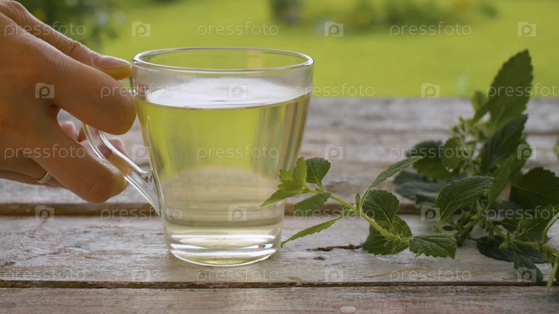 Рука крупным планом кладет прозрачную чашку мелиссы на старый деревянный стол на открытом воздухе. Свежая сырая мелисса на столе. Концепция фитотерапии