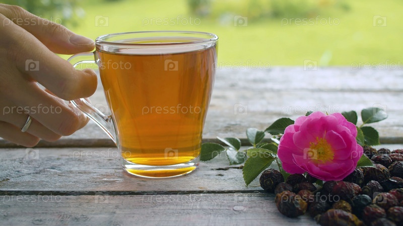 Рука крупным планом ставит стеклянную чашку отвара шиповника на старый деревянный стол на открытом воздухе. Сушеные плоды шиповника и цветок шиповника на столе. Концепция фитотерапии