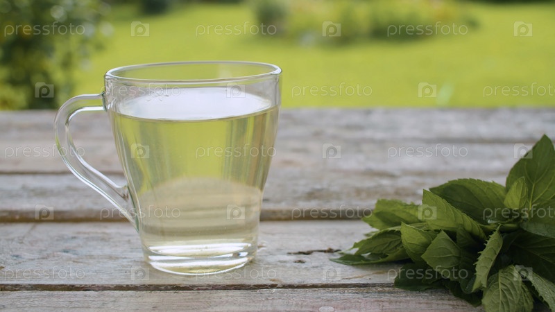 Крупным планом прозрачная чашка мятного чая на старом деревянном столе на открытом воздухе. Свежая мята на столе. Концепция фитотерапии