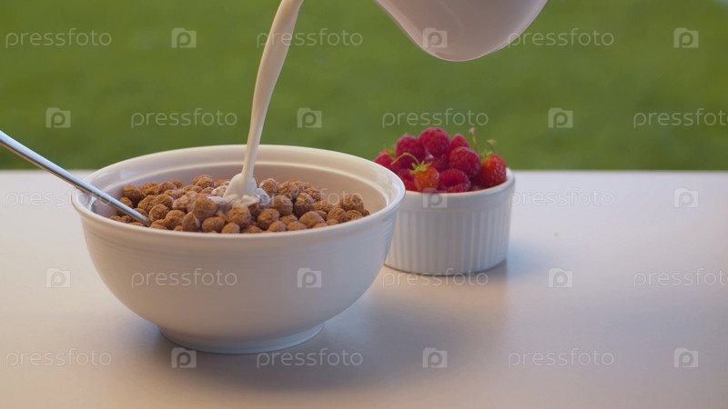 Молоко льется в кукурузные хлопья