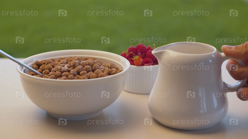 Чаша кукурузных хлопьев и малины