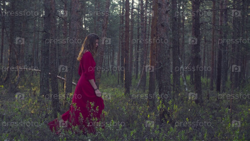 Молодая привлекательная женщина в длинном красном платье гуляет по лесу