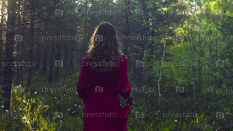 Молодая привлекательная женщина в длинном красном платье гуляет по лесу