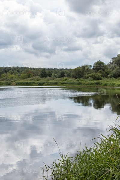 Летний пейзаж на берегу реки, пасмурный день. Калужская область, Россия