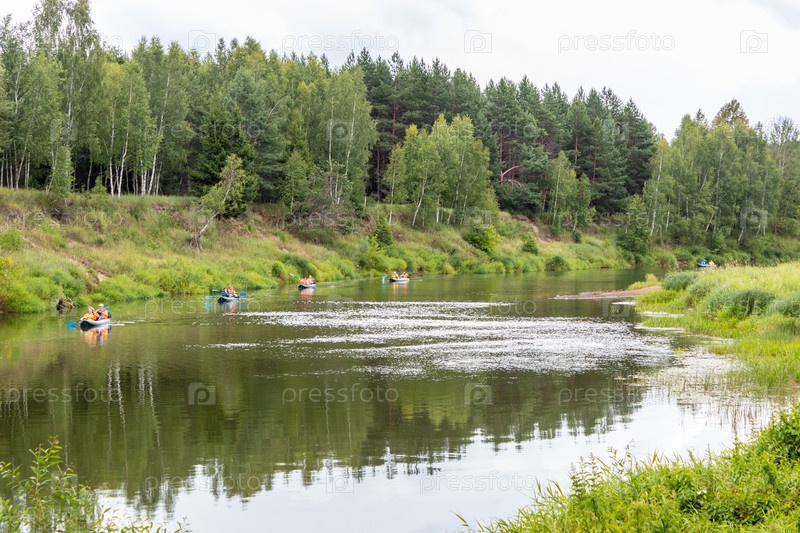 Туристы на лодках плывут по реке. Река Жиздра в Калужской области. Летом река используется туристами для отдыха. Калужская область, Россия