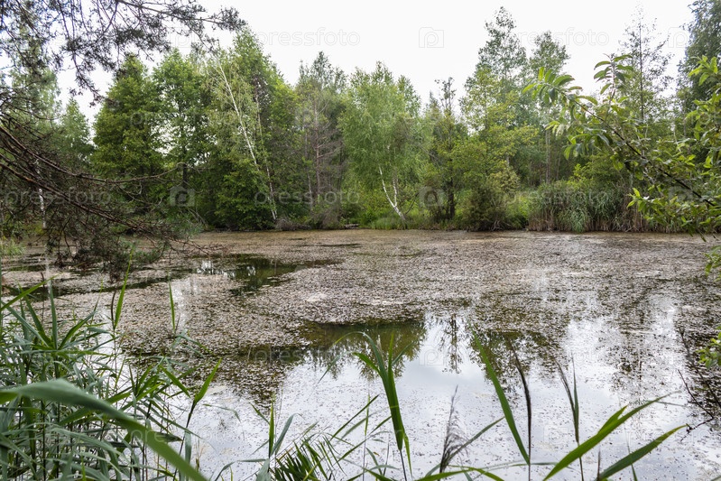 Небольшое лесное озеро с осоковыми берегами. Лето, день, заросшая грязью водная гладь озера. Калужская область, Россия