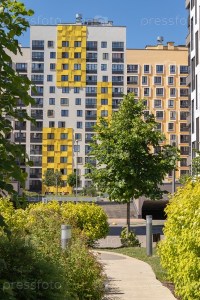 Современный многоквартирный дом с красочными фасадами на окраине города. Жилой комплекс «В лесу», Москва, Россия