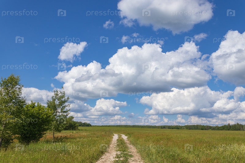 Яркий летний пейзаж с голубым небом. Проселочная дорога через поле в сельской местности. Московская область, Россия