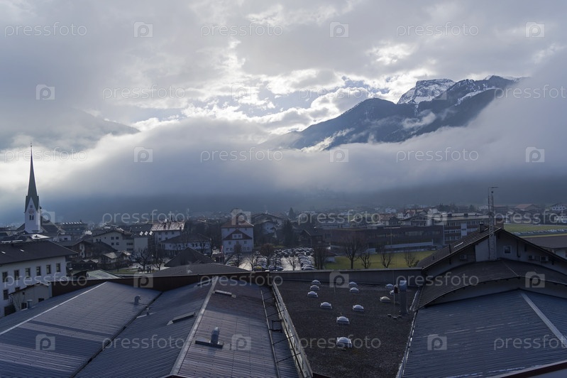 Низкая облачность скрывает горы. Горнолыжный курорт Целль-ам-Циллер, долина Циллерталь, Тироль, Австрия. Начало марта