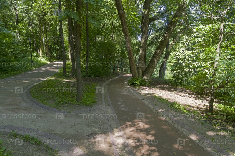 Благоустроенные дорожки в парке. Царицынский парк, Москва, Россия. Солнечный день в июне
