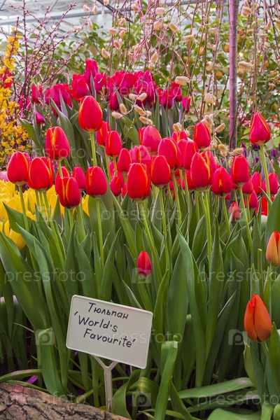Тюльпаны сорта World's Favourite в оранжерее Аптекарского сада (филиал ботанического сада МГУ, Москва).Выставка 'Весенняя репетиция', 2019 год