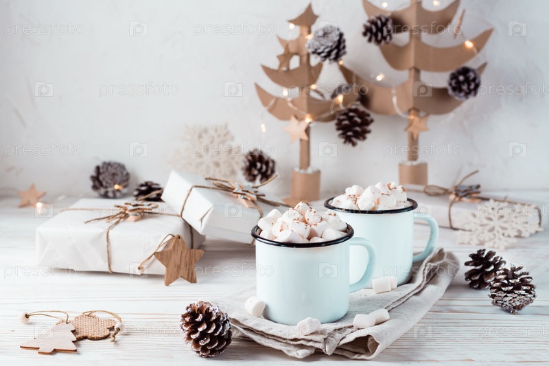 Две кружки с какао и зефиром в рождественских украшениях на белом деревянном столе. Экологичный отдых
