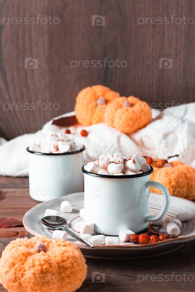 Пара кружек с какао и зефиром, тыквы и теплый свитер на деревянном столе. Согревающие осенние сладкие напитки. Вертикальный вид