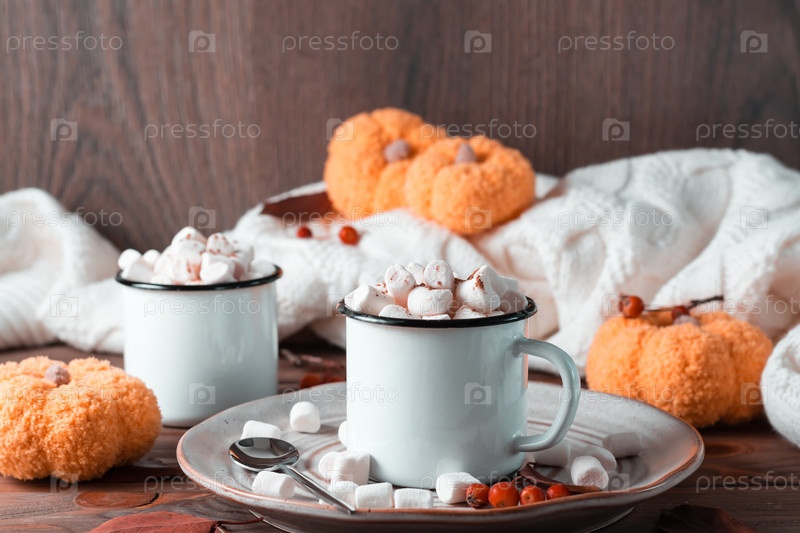 Пара кружек с какао и зефиром, тыквы и теплый свитер на деревянном столе. Согревающие осенние сладкие напитки