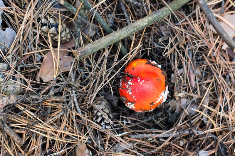 В хвойном лесу растет небольшой мухомор с красной шляпкой и белыми пятнами. Вид сверху