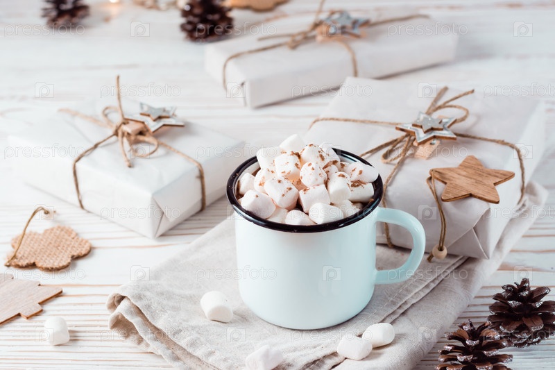 Какао и зефир в кружке рядом с ремесленными подарками на белом деревянном столе. Горячие сладкие напитки