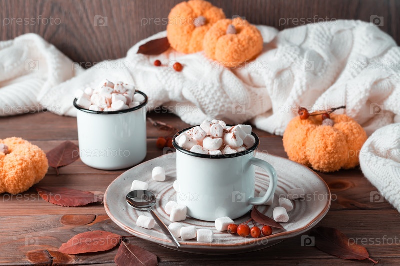 Какао и зефир в кружках в осенних украшениях с тыквами на деревянном столе. Горячие сладкие напитки