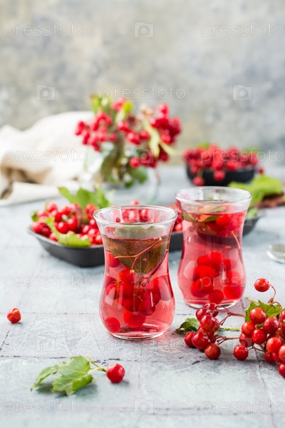 Отвар спелых ягод калины в прозрачных стаканах на столе. Альтернативная медицина, витаминное питание и велнес. вертикальный вид