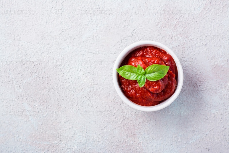 Томатная паста и листья базилика в миске на светлом фоне. Овощная и вегетарианская пища. Витамины и детокс-диета. Скопируйте пространство. Вид сверху
