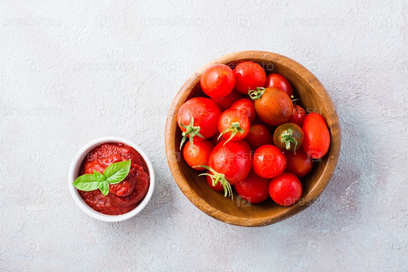 Томатная паста и листья базилика в миске и помидоры на тарелке на светлом фоне. Овощная и вегетарианская пища. Витамины и детокс-диета. Вид сверху