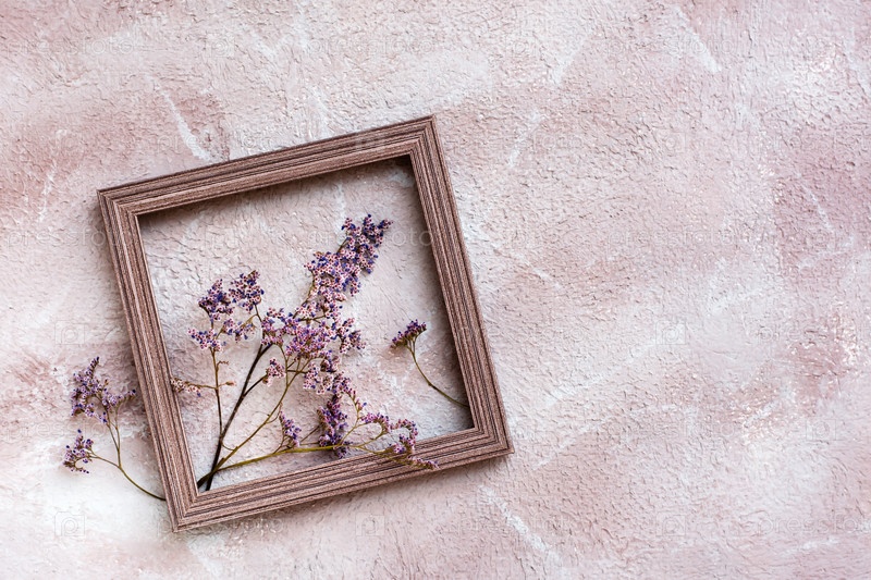 Сухие фиолетовые цветы в деревянной раме на текстурированном фоне. Романтическая поздравительная винтажная открытка. Вид сверху. Копировать пространство
