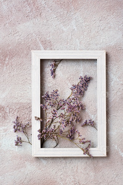 Сухие фиолетовые цветы в деревянной раме на текстурированном фоне. Романтическая поздравительная винтажная открытка. Верхний и вертикальный вид