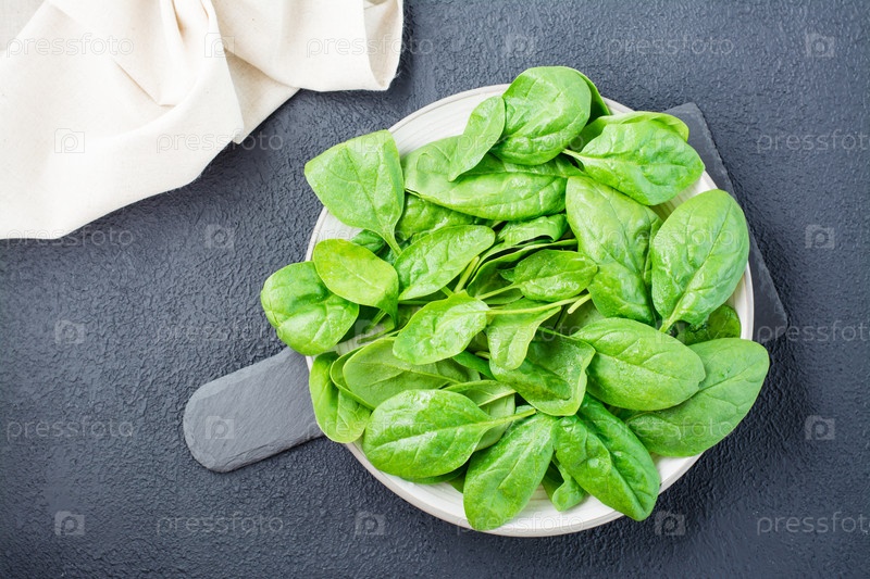 Свежие листья шпината в каплях воды на тарелке на грифельной доске на черном фоне. Вегетарианское, оздоровительное и детокс-питание. Вид сверху