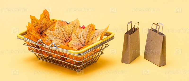 Металлическая корзина для покупок в магазине, наполненная осенними листьями и парой бумажных пакетов на желтом фоне. Черная пятница распродажа подарков. Веб-баннер