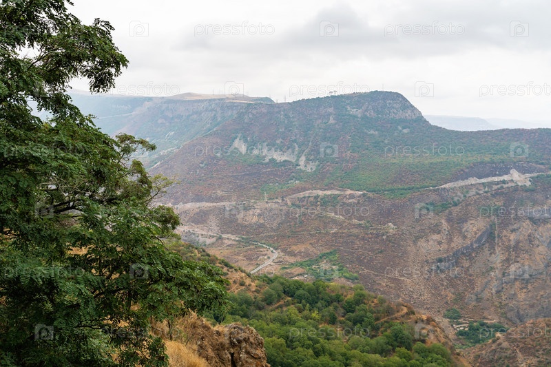 Деревья на краю обрыва и туманный вид на горы в Армении