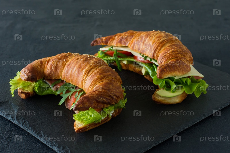 Бутерброды с круассаном с соленым лососем на столе, подаются со свежими листьями салата, рукколой и овощами на черном фоне