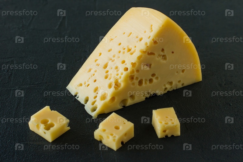 Сыр Радамер на фоне черного бетона. треугольный кусок желтого швейцарского сыра из коровьего молока с дырочками