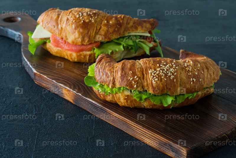 Бутерброды с круассаном с соленым лососем на столе, подаются со свежими листьями салата, рукколой и овощами на черном фоне