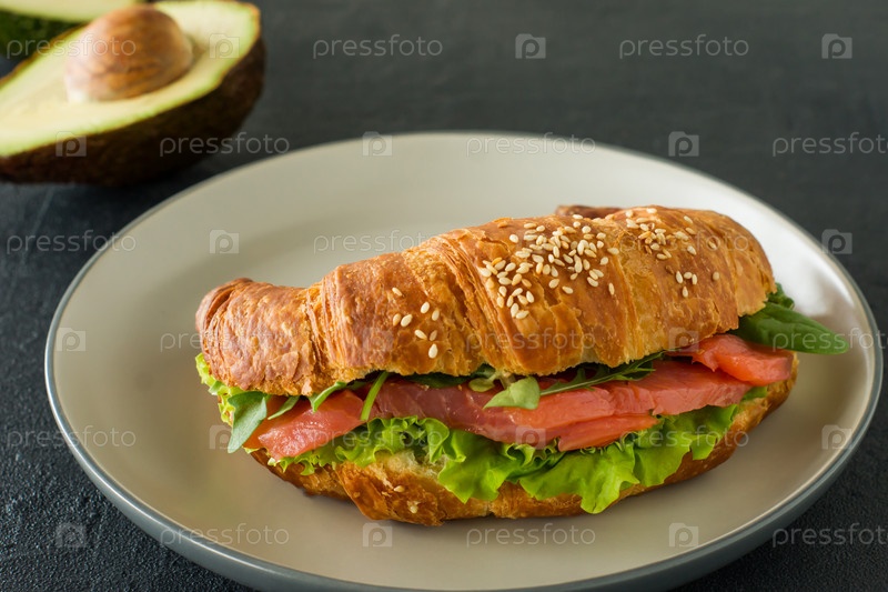 Сэндвич с круассаном с соленым лососем на тарелке, подается со свежими листьями салата, рукколой и овощами на черном фоне