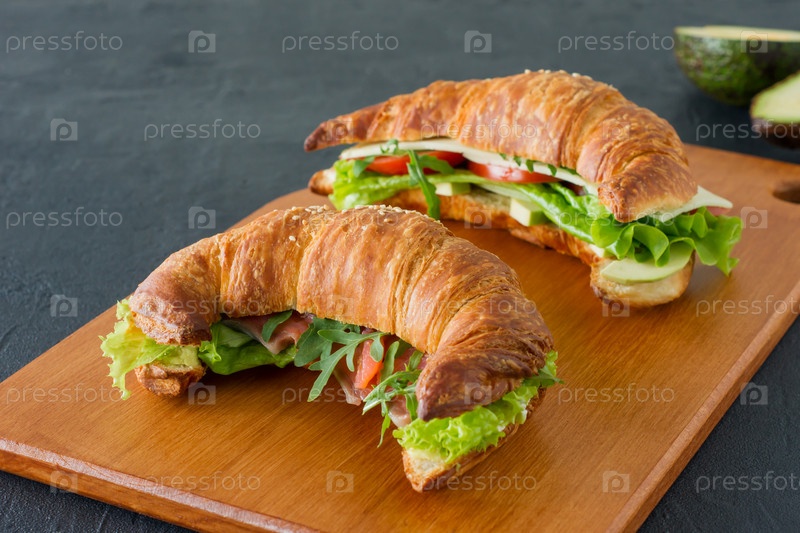 Аппетитные французские бутерброды с круассаном с лососем, авокадо, шпинатом и салатом, подаваемые на деревянном столе на сером фоне. Вкусная еда на завтрак