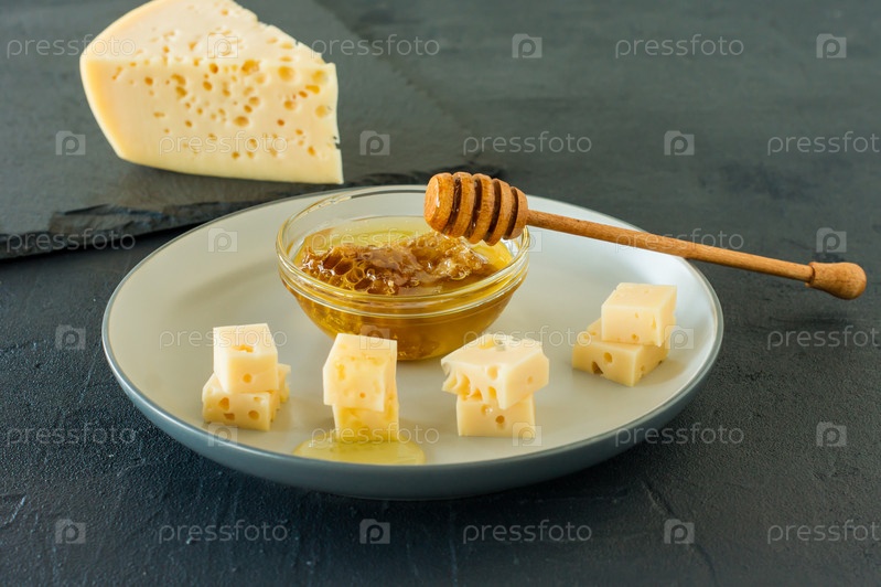 Сыр радамер на тарелке с медом. треугольный кусок желтого швейцарского сыра из коровьего молока с дырочками