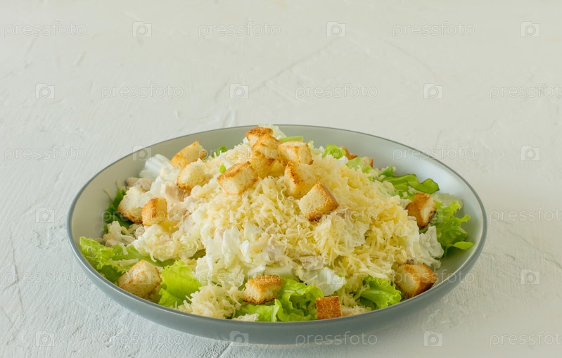 Традиционный салат цезарь в тарелке на белом столе с листьями, соусом, гренками и пармезаном