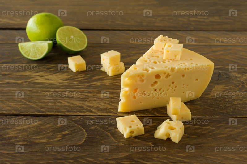 Сыр Радамер на деревянной доске с лаймом. треугольный кусок желтого швейцарского сыра из коровьего молока с дырочками