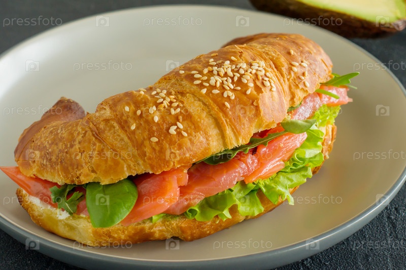 Бутерброд с круассаном с лососем, сыром рикотта и рукколой на тарелке на темном фоне. Вид сбоку крупным планом