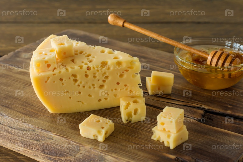 Сыр радамер на деревянной доске подается с медом. треугольный кусок желтого швейцарского сыра из коровьего молока с дырочками