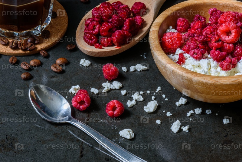 Творог с малиной и кофе в чашке на завтрак
